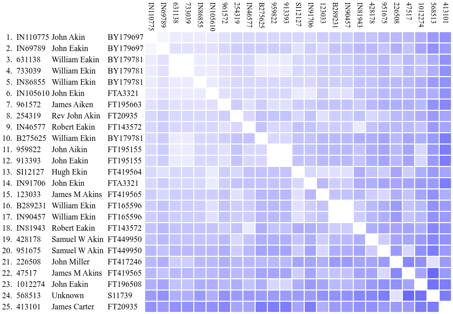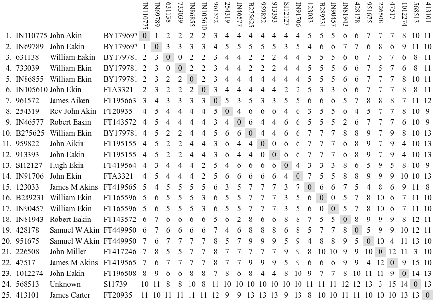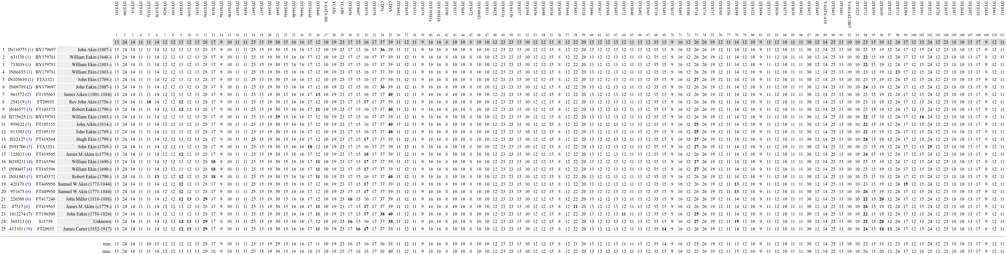 Here we compare the genetic distance between each tester rather than to the modal. This gives us a better idea as to how closely the testers are related to one another as opposed each to the modal, or mutual ancestor. The results tend to clump together by haplogroup. However, due to the volatile nature of STRs, the clumping is often inconsistent, as shown by the same graphics in the somewhat larger YP4248 Subclade Project. For this reason, STRs are unreliable for phylogeny. Nevertheless, the study can help direct us toward those kits that could provide the greatest impact on the project for Big Y upgrades.