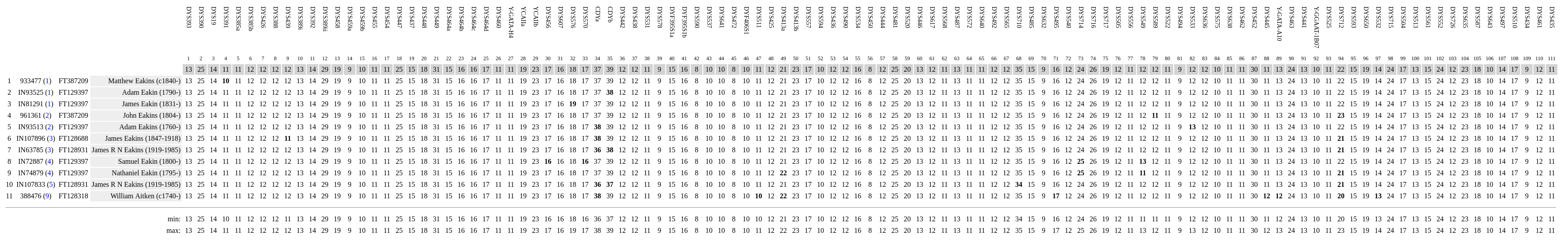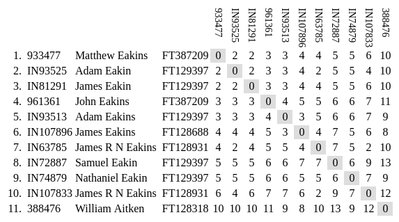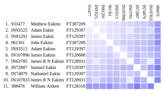Here we compare the genetic distance between each tester rather than to the modal. This gives us a better idea as to how closely the testers are related to one another as opposed each to the modal, or mutual ancestor. The results tend to clump together by haplogroup. However, due to the volatile nature of STRs, the clumping is often inconsistent, as shown by the same graphics in the somewhat larger YP4248 Subclade Project. For this reason, STRs are unreliable for phylogeny. Nevertheless, the study can help direct us toward those kits that could provide the greatest impact on the project for Big Y upgrades.