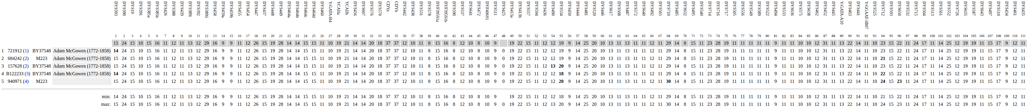 The top line in this graphic, in gray, is the modal value. It represents the most common value found among each tester. The total number of mismatches any one tester has to the modal is noted in blue parenthesis next to the tester's kit number. This number is referred to as the genetic distance or GD. For example, a tester might be a GD of 1 from the modal's CDYb marker but with a total GD of 5 from the modal as a whole.