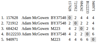 The color version results from replacing the numeric values with color values. This doesn't tell us much for small groups but can be informative for groups of ten and more.