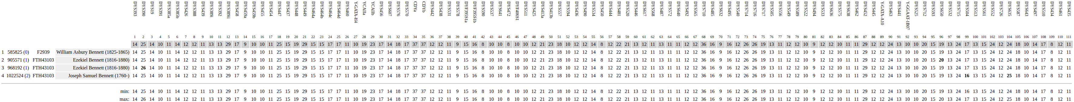 The top line in this graphic, in gray, is the modal value. It represents the most common value found among each tester. The total number of mismatches any one tester has to the modal is noted in blue parenthesis next to the tester's kit number. This number is referred to as the genetic distance or GD. For example, a tester might be a GD of 1 from the modal's CDYb marker but with a total GD of 5 from the modal as a whole.