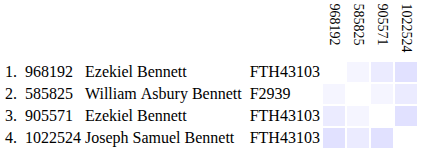 Here we compare the genetic distance between each tester rather than to the modal. This gives us a better idea as to how closely the testers are related to one another as opposed each to the modal, or mutual ancestor. The results tend to clump together by haplogroup. However, due to the volatile nature of STRs, the clumping is often inconsistent, as shown by the same graphics in the somewhat larger YP4248 Subclade Project. For this reason, STRs are unreliable for phylogeny. Nevertheless, the study can help direct us toward those kits that could provide the greatest impact on the project for Big Y upgrades.