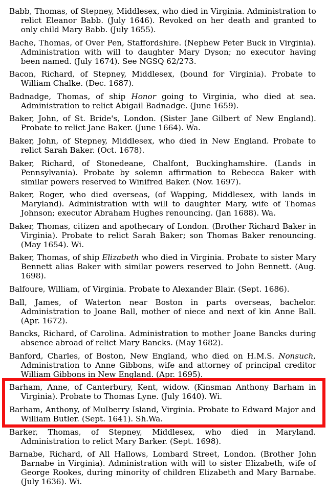 Barham mentions his brother-in-law, Richard Bennett, wife Elizabeth, and mother-in-law "mother Bennett." The stated relationship to Bennett has been interpreted as meaning that his sister, Anne, was married to Richard. I initially bought into that line of thinking as well. But, as is often the case, the truth is a bit more subtle. Firstly, Anthony doesn't refer to this supposed sister. In fact, it's not been demonstrated he had a sister. More importantly, Barham's in-law relationship to Richard is documented through his wife, Elizabeth Pierce, the daughter of Thomas and Alice Pierce. (Alice married Thomas Bennett, Richard's father, after the death of Peirce. She was probably his mother.) Despite what people have come to believe, no documentation has been presented that Anne Barham ever immigrated to Virginia let alone was married to Richard Bennett.