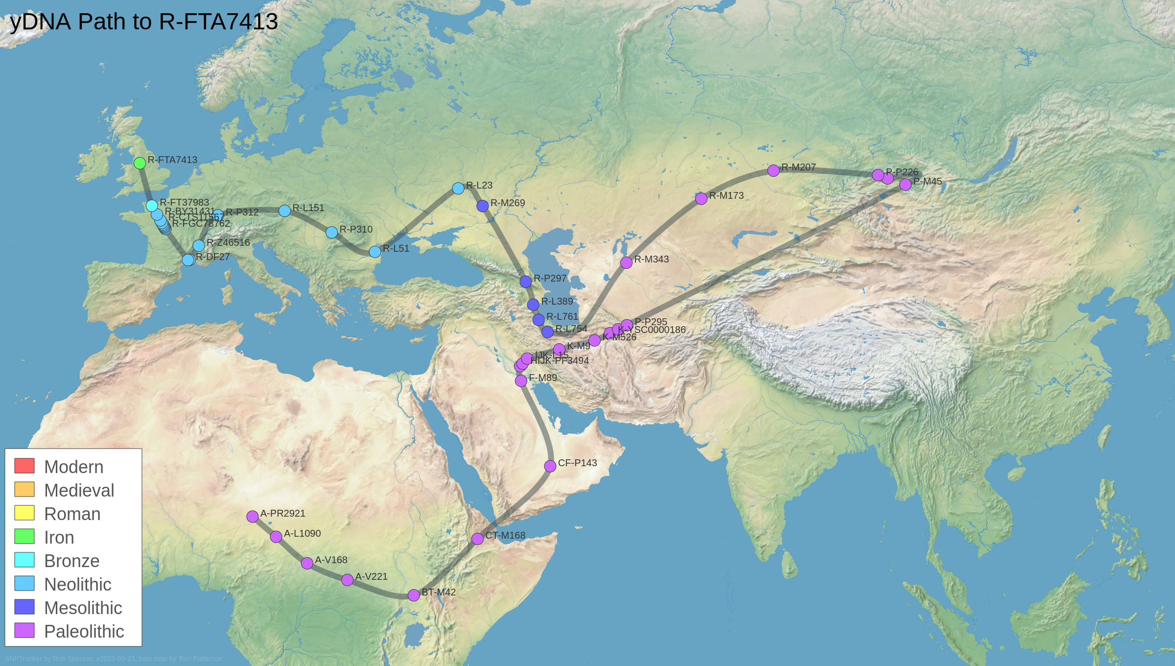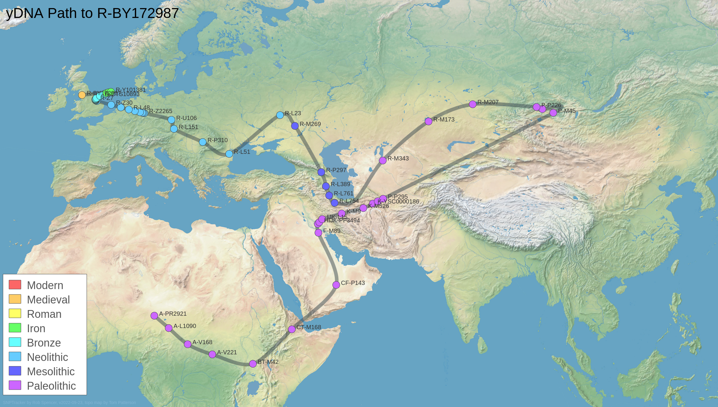 The first thing to remember is that the Y chromosome passes 100% through every male lineage and that any newly emerged SNP markers accumulate in the various lineages. (What was, is.) Thus, every man holds an archive of the travels of his male lineage in each of the trillions of cells in his body. Naturally, the place names aren't recorded. It's up to us to figure it out.