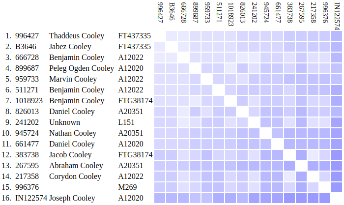 Corydon Cooley, included on the SNP tree, is an interesting case. Until a descendant tested, we had no idea where he belonged. Although he has the Benjamin markers, he was born 220 years later than the old man. It seems likely Corydon was descended from him but Benjamin, indeed, might have had a brother, cousin, etc. with that same marker. The genealogy sill needs to be done.