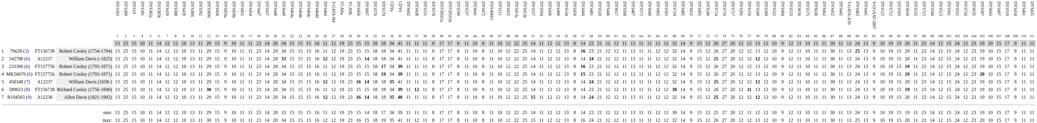 The top line in this graphic, in gray, is the modal value. It represents the most common value found among each tester. The total number of mismatches any one tester has to the modal is noted in blue parenthesis next to the tester's kit number. This number is referred to as the genetic distance or GD. For example, a tester might be a GD of 1 from the modal's CDYb marker but with a total GD of 5 from the modal as a whole.