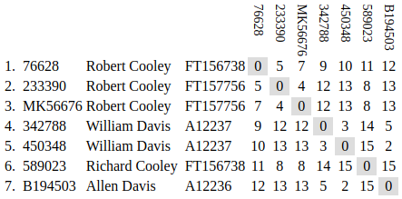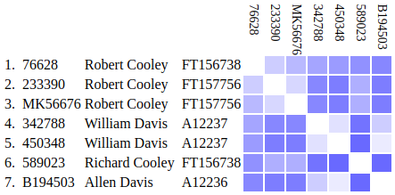Here we compare the genetic distance between each tester rather than to the modal. This gives us a better idea as to how closely the testers are related to one another as opposed each to the modal, or mutual ancestor. The results tend to clump together by haplogroup. However, due to the volatile nature of STRs, the clumping is often inconsistent, as shown by the same graphics in the somewhat larger YP4248 Subclade Project. For this reason, STRs are unreliable for phylogeny. Nevertheless, the study can help direct us toward those kits that could provide the greatest impact on the project for Big Y upgrades.