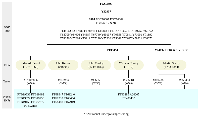 The following table is simply a bare summary of the results and can be copied and pasted into a spreadsheet. This is helpful for keeping track of larger projects. With the exception of those indicated by an asterisk, the novel SNPs (novel variants) can be tested at YSEQ.net for $18 each and a one-time kit fee of $6 for the first order.