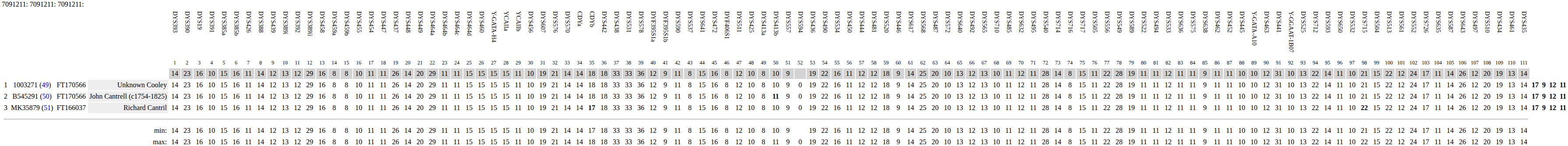 The top line in this graphic, in gray, is the modal value. It represents the most common value found among each tester. The total number of mismatches any one tester has to the modal is noted in blue parenthesis next to the tester's kit number. This number is referred to as the genetic distance or GD. For example, a tester might be a GD of 1 from the modal's CDYb marker but with a total GD of 5 from the modal as a whole.