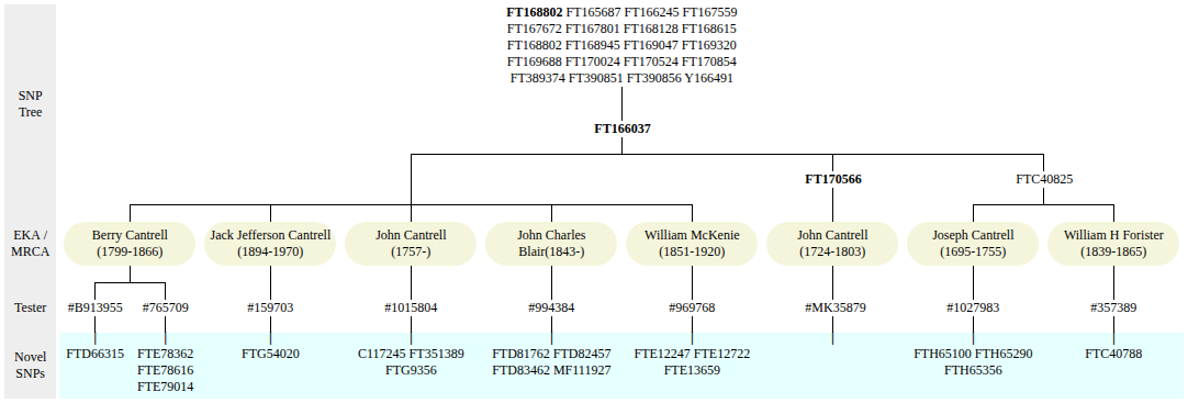 Note that there are at least seven surnames associated with I-FT166037: Blair, Bohannan, Cantrell, Cooley, Hutchins, Lafser, and McKenzie. I'm personally not convinced that Cantrell is the ancestral name.