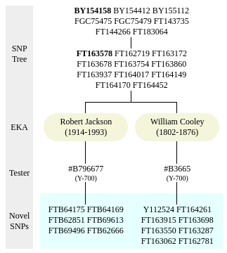 The following table is simply a bare summary of the results and can be copied and pasted into a spreadsheet. This is helpful for keeping track of larger projects. With the exception of those indicated by an asterisk, the novel SNPs (novel variants) can be tested at YSEQ.net for $18 each and a one-time kit fee of $6 for the first order.