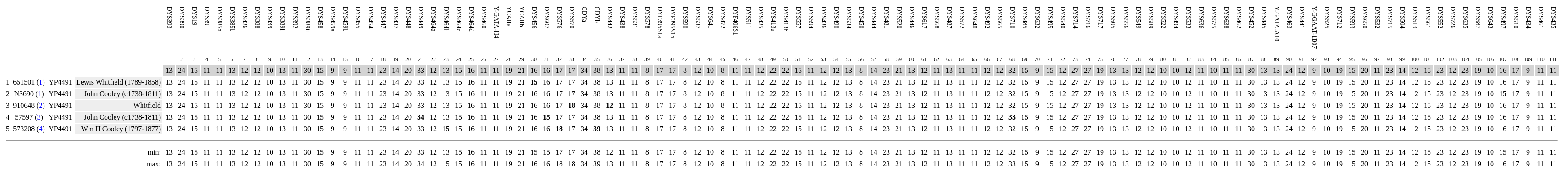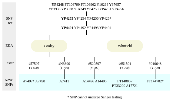 The following table is simply a bare summary of the results and can be copied and pasted into a spreadsheet. This is helpful for keeping track of larger projects. With the exception of those indicated by an asterisk, the novel SNPs (novel variants) can be tested at YSEQ.net for $18 each and a one-time kit fee of $6 for the first order.