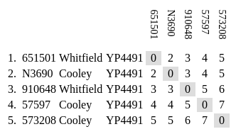 Here we compare the genetic distance between each tester rather than to the modal. This gives us a better idea as to how closely the testers are related to one another as opposed each to the modal, or mutual ancestor. The results tend to clump together by haplogroup. However, due to the volatile nature of STRs, the clumping is often inconsistent, as shown by the same graphics in the somewhat larger YP4248 Subclade Project. For this reason, STRs are unreliable for phylogeny. Nevertheless, the study can help direct us toward those kits that could provide the greatest impact on the project for Big Y upgrades.