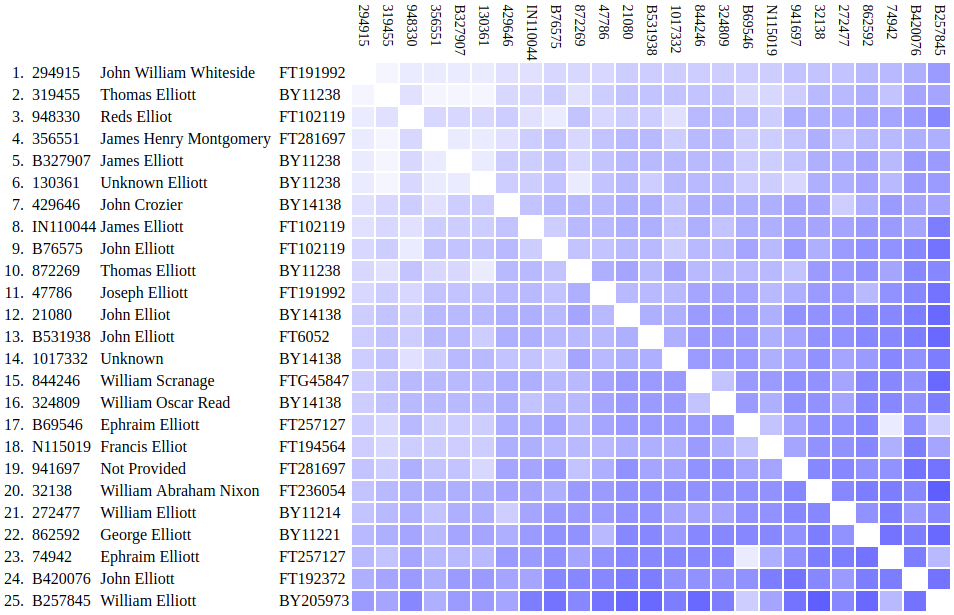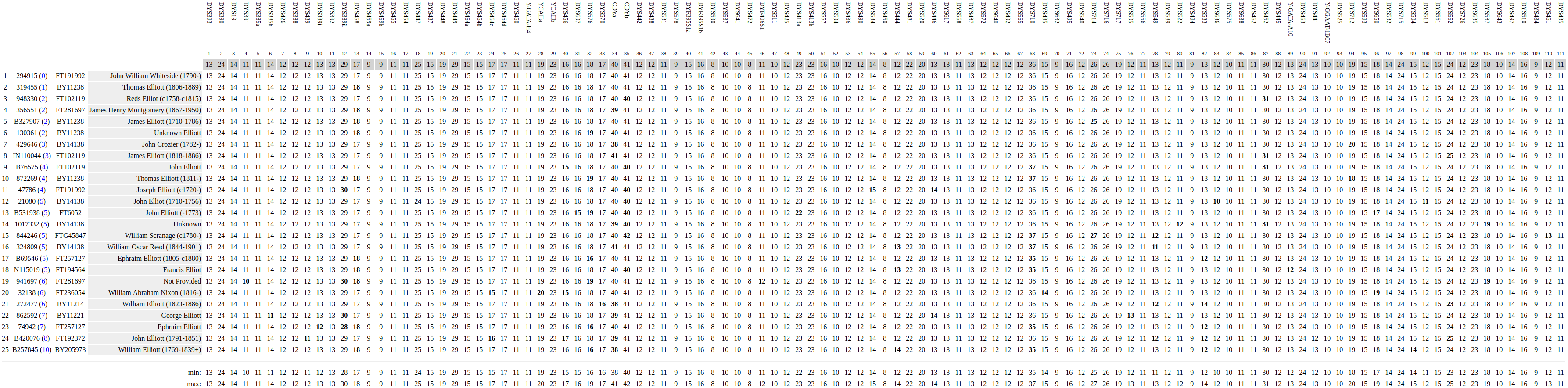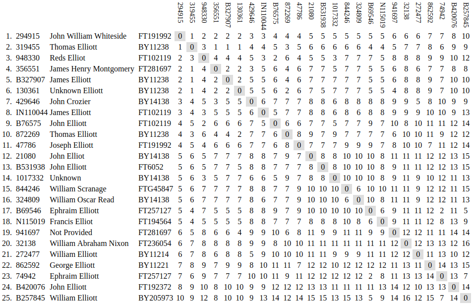 Here we compare the genetic distance between each tester rather than to the modal. This gives us a better idea as to how closely the testers are related to one another as opposed each to the modal, or mutual ancestor. The results tend to clump together by haplogroup. However, due to the volatile nature of STRs, the clumping is often inconsistent, as shown by the same graphics in the somewhat larger YP4248 Subclade Project. For this reason, STRs are unreliable for phylogeny. Nevertheless, the study can help direct us toward those kits that could provide the greatest impact on the project for Big Y upgrades.