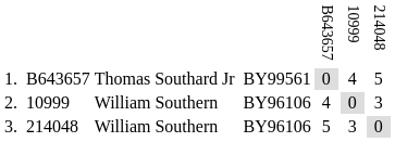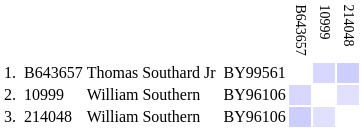 Here we compare the genetic distance between each tester rather than to the modal. This gives us a better idea as to how closely the testers are related to one another as opposed each to the modal, or mutual ancestor. The results tend to clump together by haplogroup. However, due to the volatile nature of STRs, the clumping is often inconsistent, as shown by the same graphics in the somewhat larger YP4248 Subclade Project. For this reason, STRs are unreliable for phylogeny. Nevertheless, the study can help direct us toward those kits that could provide the greatest impact on the project for Big Y upgrades.