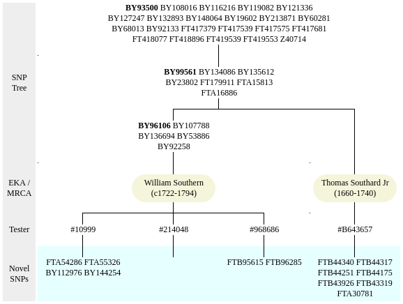 The following table is simply a bare summary of the results and can be copied and pasted into a spreadsheet. This is helpful for keeping track of larger projects. With the exception of those indicated by an asterisk, the novel SNPs (novel variants) can be tested at YSEQ.net for $18 each and a one-time kit fee of $6 for the first order.