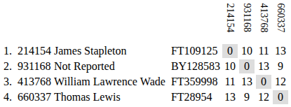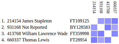 Here we compare the genetic distance between each tester rather than to the modal. This gives us a better idea as to how closely the testers are related to one another as opposed each to the modal, or mutual ancestor. The results tend to clump together by haplogroup. However, due to the volatile nature of STRs, the clumping is often inconsistent, as shown by the same graphics in the somewhat larger YP4248 Subclade Project. For this reason, STRs are unreliable for phylogeny. Nevertheless, the study can help direct us toward those kits that could provide the greatest impact on the project for Big Y upgrades.