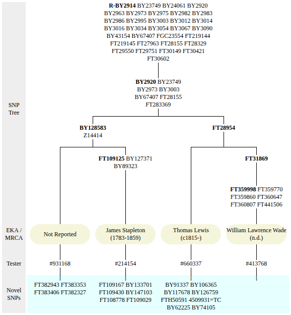 The following table is simply a bare summary of the results and can be copied and pasted into a spreadsheet. This is helpful for keeping track of larger projects. With the exception of those indicated by an asterisk, the novel SNPs (novel variants) can be tested at YSEQ.net for $18 each and a one-time kit fee of $6 for the first order.